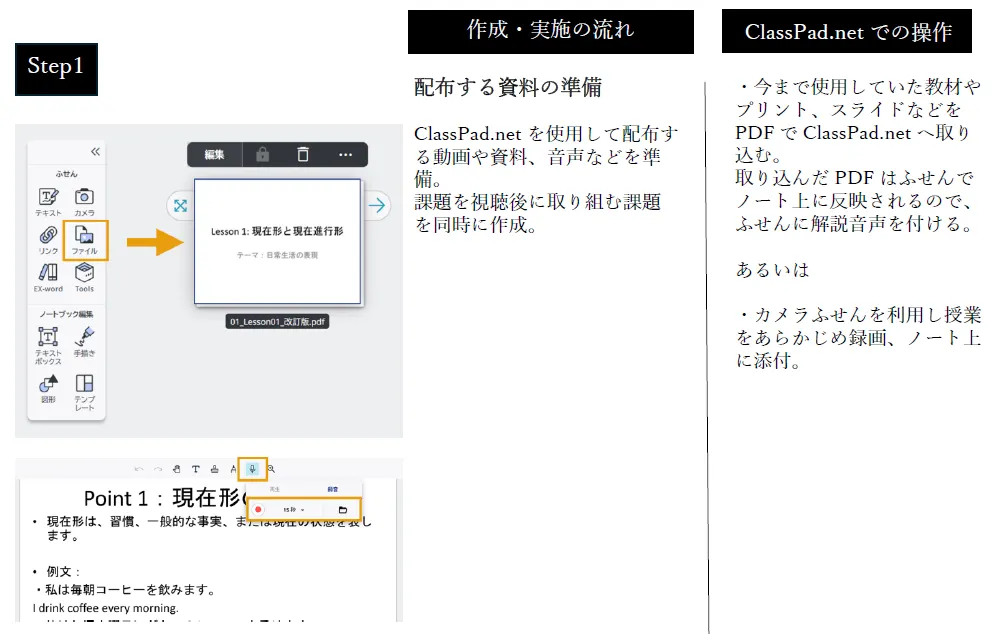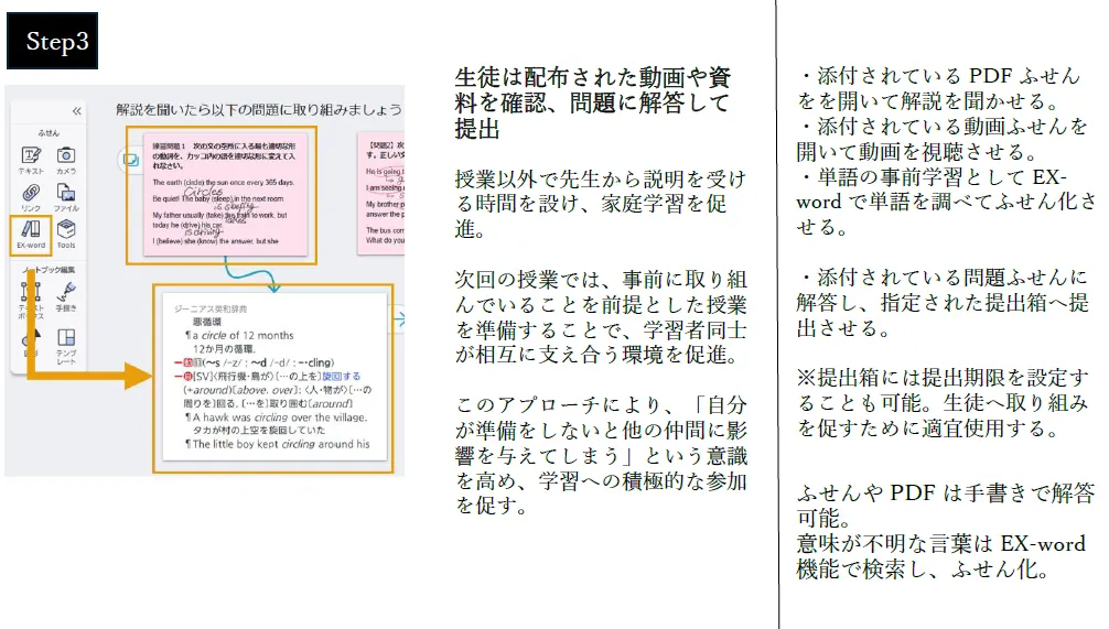 授業動画や音声資料を事前配布することで、授業中は探究活動や発展的な学びに集中。生徒の主体性を伸ばし、繰り返し学習や個別対応も可能です。
