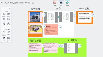 プリントと板書をClassPad.netで作る ClassPad.netでプリントや板書を一元管理! 教材作成から配布・活用までデジタル化し、印刷不要&再利用可能。動画や問題も添付でき、ICTならではの効率的な授業運営が実現します。生徒同士の書き込み・共有で主体的な学びが広がり、デジタルリテラシーも自然に身につきます。 是非お